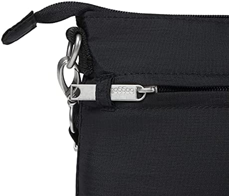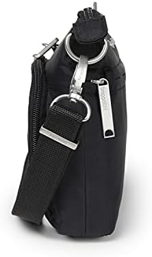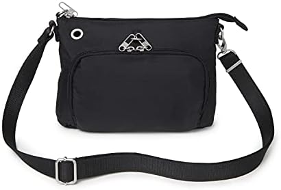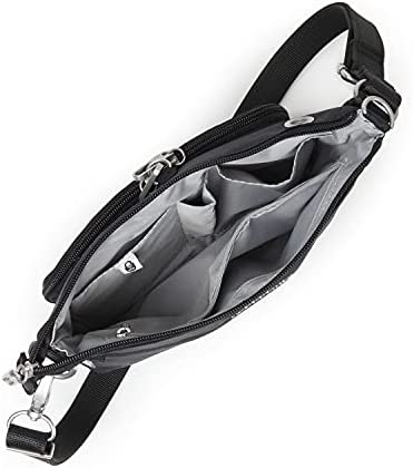 The Baggallini Securtex® Anti-Theft Memento Crossbody ensures that you enjoy your next trip worry-free. The stylish purse features slash resistant panels, a double-cable cut-resistant strap, locking zippers, and RFID protection. An adjustable, cut-resistant shoulder strap allows the purse to not only be customized to fit you perfectly, but it can also be securely attached to a post or chair. This water-resistant purse weighs 0.56 pounds, and measures 9.75” wide, 7” tall, and 1.5” deep.