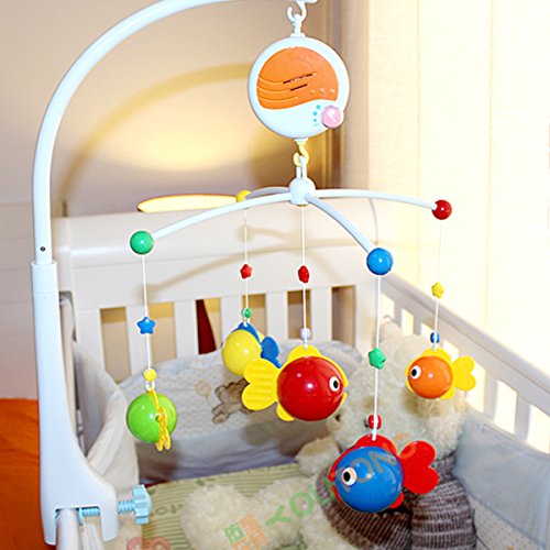 Music rotate rack, the decoration and toys for nursery and your babies.Hanging rotating bell fair-sounding piano tune, 12 light melodies, adjustable volume.A dual-use toy, the lovely fish can be put in water as the bath toys.High quality: good quality with smooth and colorful surfaces, no odd smells. It is safe for children to play it.
