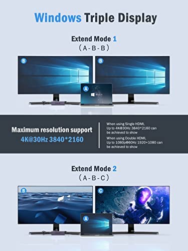 Triple Display for Windows: only support the Triple display for Windows. In extend mode, allows you to display the content of your laptop to 2 monitors which maximum output up to 3840*2160 4K@30hz resolution.MST FUNCTION: Mac OS DOSE NOT support. only supported by Windows.Mac OS System: For Apple laptop, its not support extend 2 different screens, displays are Mirror mode only which is limited by Mac itself. means that the two external monitors are same. but laptop screen can display different content from them.Not support some usb c devices: To use this product the host USB-C port from your device must support DisplayPort Alt Mode and Power Delivery.4K HDMI Display: The final resolution of HDMI output depends on your host devices. (Only when your devices support 4K resolution, the video output will be 4K). Use HDMI2.0/DP1.4 or above cables for optimum performance.