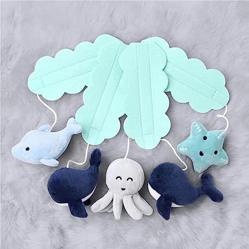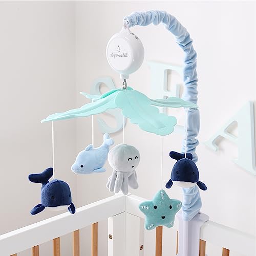 Sea life Musical Mobile by The Peanutshell helps to promote baby’s auditory development, motor skills and visual stimulation. Our expertly designed nursery must have features plush whales, a dolphin, octopus, and starfish characters in various blue tones under scalloped aqua arm covers. The digital music box plays snippets of 12 different lullabies to soothe your little one gently to sleep. Easily switch music on/off or between songs with the simple touch of a button. Two velour arm covers in light and navy blue are provided for a customized designer look. This item coordinates perfectly with our Nautical 3 Piece Crib Set and 4 Pack Fitted Sheets to create the prefect ocean themed baby room. Battery operated. Requires two AA batteries that are not included.