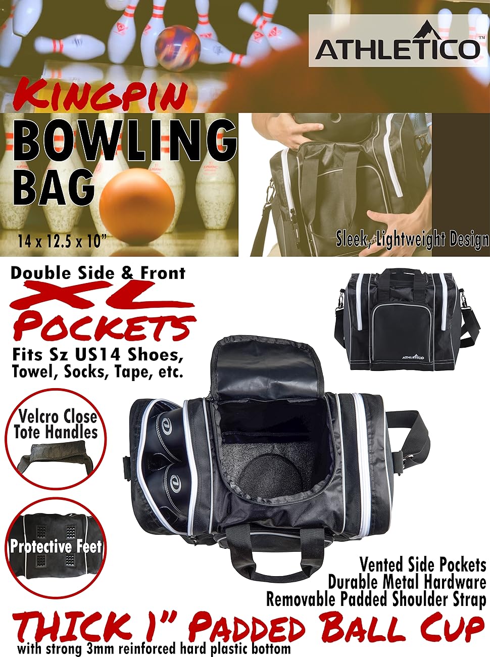 Athletico Kingpin Bowling Bag for Single Ball - Single Ball Tote Bag With Padded Ball Holder - Fits a Single Pair of Bowling Shoes Up to Mens Size 14