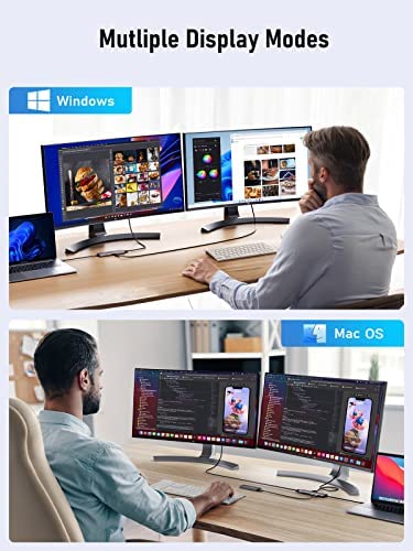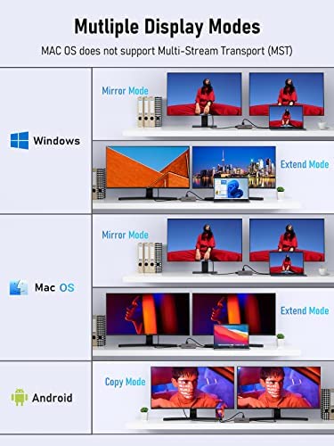 Triple Display for Windows: only support the Triple display for Windows. In extend mode, allows you to display the content of your laptop to 2 monitors which maximum output up to 3840*2160 4K@30hz resolution.MST FUNCTION: Mac OS DOSE NOT support. only supported by Windows.Mac OS System: For Apple laptop, its not support extend 2 different screens, displays are Mirror mode only which is limited by Mac itself. means that the two external monitors are same. but laptop screen can display different content from them.Not support some usb c devices: To use this product the host USB-C port from your device must support DisplayPort Alt Mode and Power Delivery.4K HDMI Display: The final resolution of HDMI output depends on your host devices. (Only when your devices support 4K resolution, the video output will be 4K). Use HDMI2.0/DP1.4 or above cables for optimum performance.